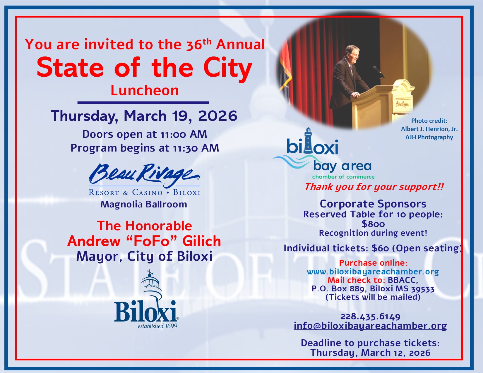 State of the City: The 2026 Biloxi State of the City luncheon and address by Mayor Andrew “FoFo” Gilich is scheduled for Thursday, March 19, 2026, at the Beau Rivage Resort & Casino. The event, hosted by the Biloxi Bay Area Chamber of Commerce, will begin with doors opening at 11:00 a.m. To see the flyer, click here.