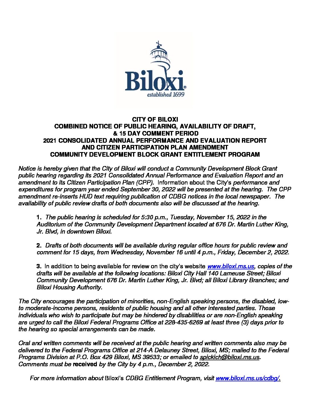 2021 CDBG CAPER CPP Amendment Combined Notice Posting English 10 31 22